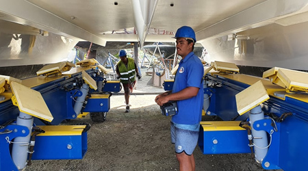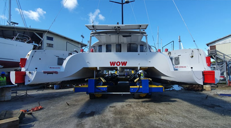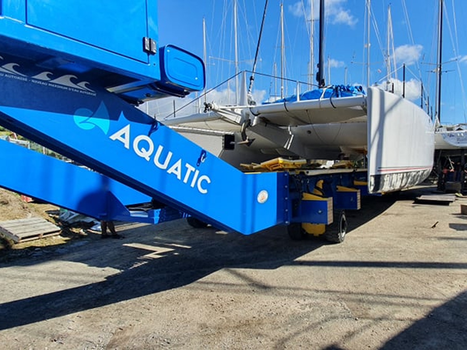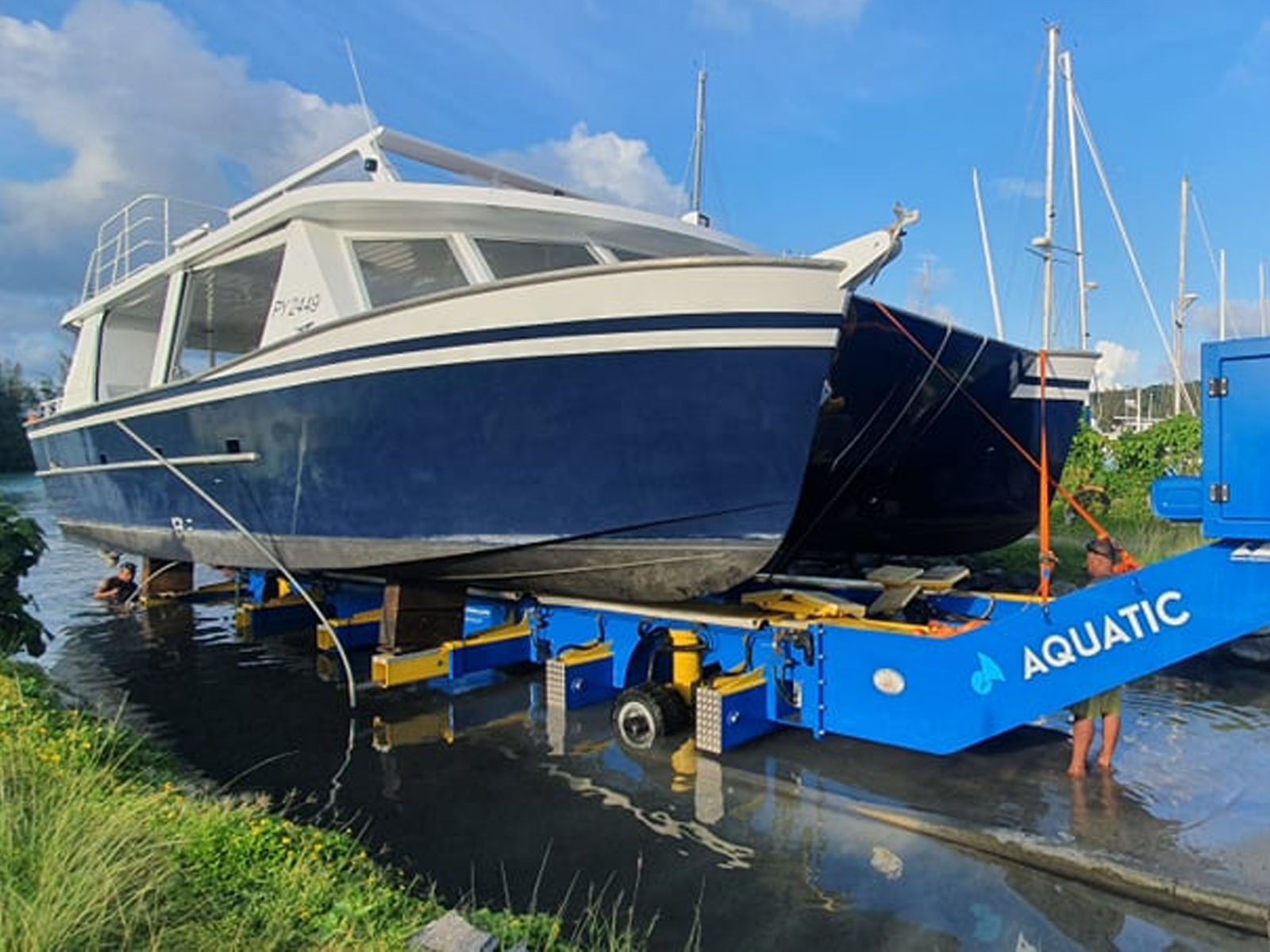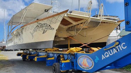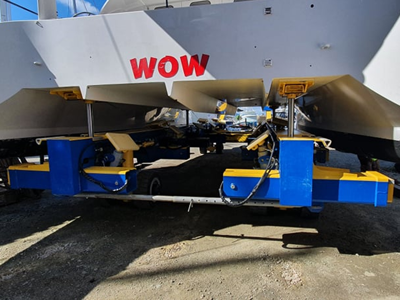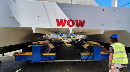 Tilpassede gafler for stabil og skånsom håndtering av katamaranskrog.